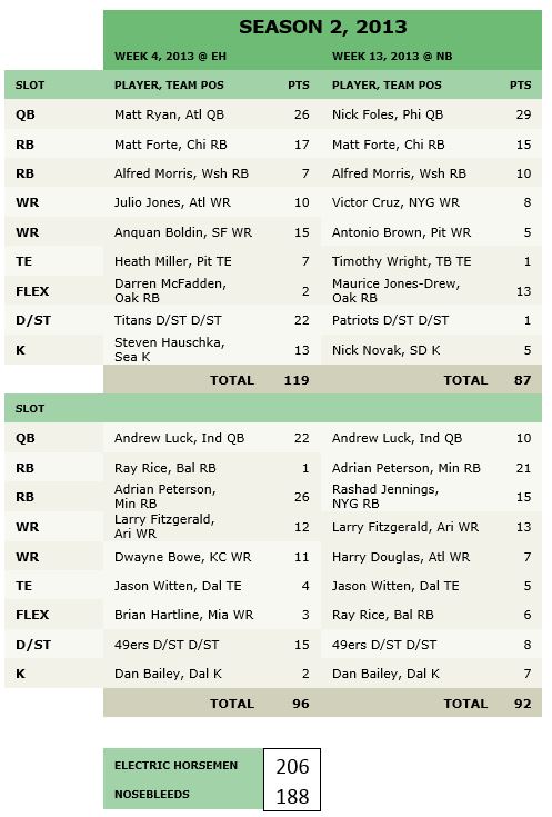 It would come down to Week 13 again. The Nosebleeds had already locked a playoff spot and now had their opportunity, once again, to knock out the Horsemen. In 2012 and 2013 the same scenario had played out, and in both years the Nosebleeds went to the playoffs and the Horsemen went home. Team records were misleading this time around, the 6-5-1 Horsemen were leading the league in scoring – 20 more PPG than the Nosebleeds… who were 8-4 coming into the finale.